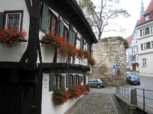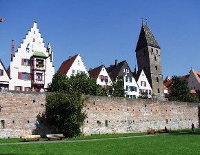 Ulmer Stadtmauer mit dem "Metzgerturm" das "schiefe Haus" in Ulm